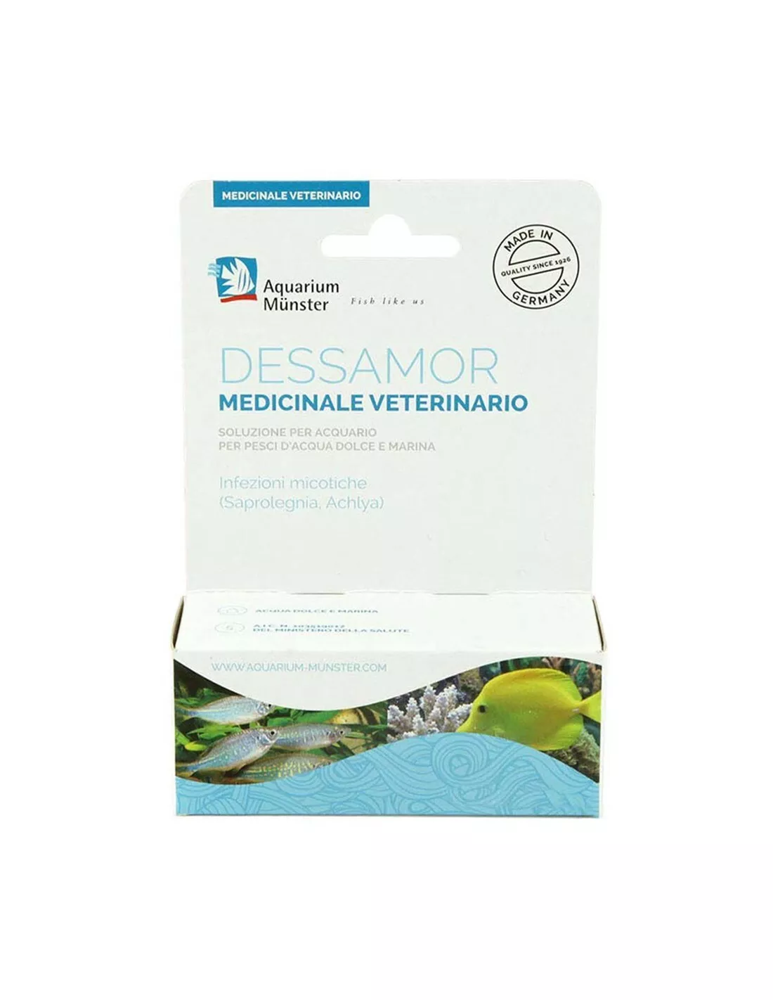Aquarium Munster Dessamor è il farmaco veterinario di riferimento per la cura dei funghi nei pesci d’acquario (Saprolegnia, Achlya) e per le infezioni batteriche associate. La sua formula tedesca ad ampio spettro agisce efficacemente contro le micosi che si manifestano con formazioni cotonose su corpo e pinne.