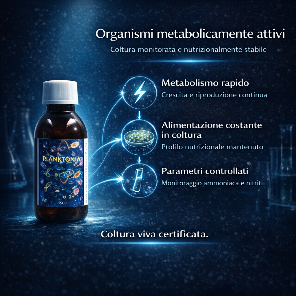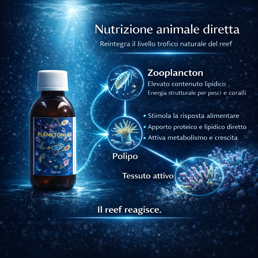 PLANKTONIA è un preparato a base di zooplancton biologicamente attivo, sviluppato per fornire al reef una componente trofica animale completa, dinamica e nutrizionalmente ricca.