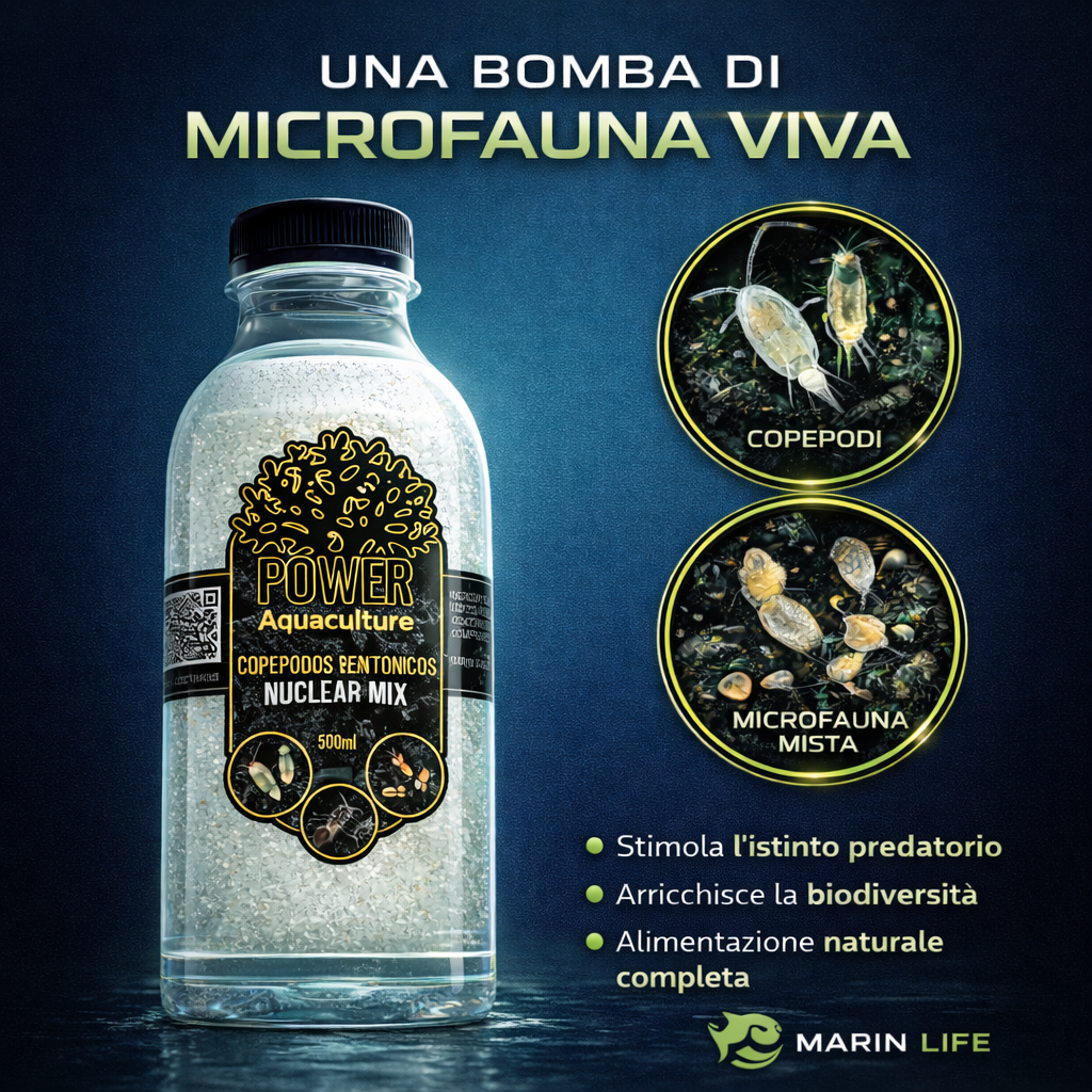 Il Nuclear Mix di Power Aquaculture è la coltura di copepodi più concentrata disponibile sul mercato. Combina Apocyclops panamensis (70%) con Tisbe biminiensis e Tisbe battagliai, creando un’onda d’urto biologica che colonizza istantaneamente ogni angolo del reef.